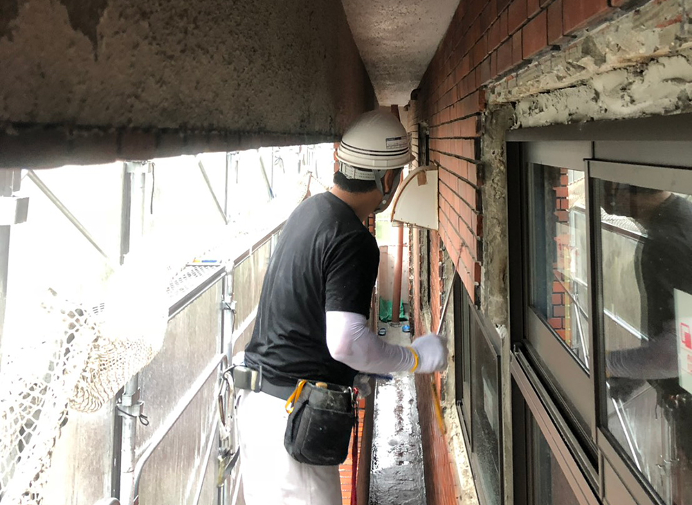 外壁の欠けた部分や、躯体内部の鉄筋が劣化して膨張したことで欠けた部分を取りのぞき、防錆処理を施します。